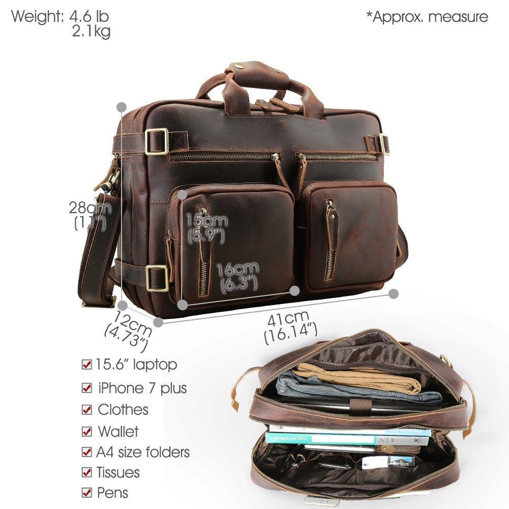 This 4 ways multifunctional leather briefcase has perfect combination of durable,practical and affordable design.You can easily convert it to cross-body bag,backpack,vertical tote bag and horizontal tote bag.