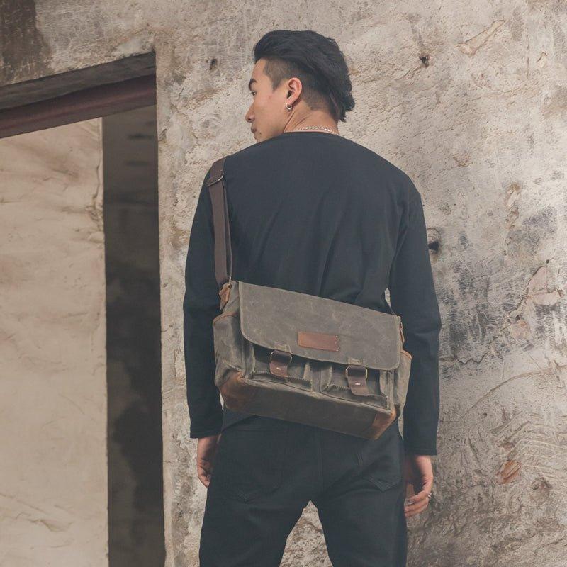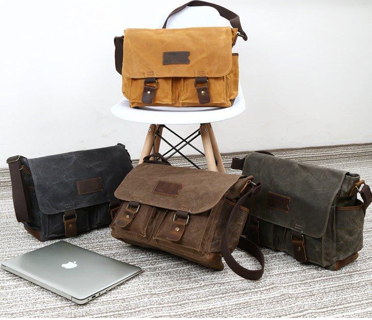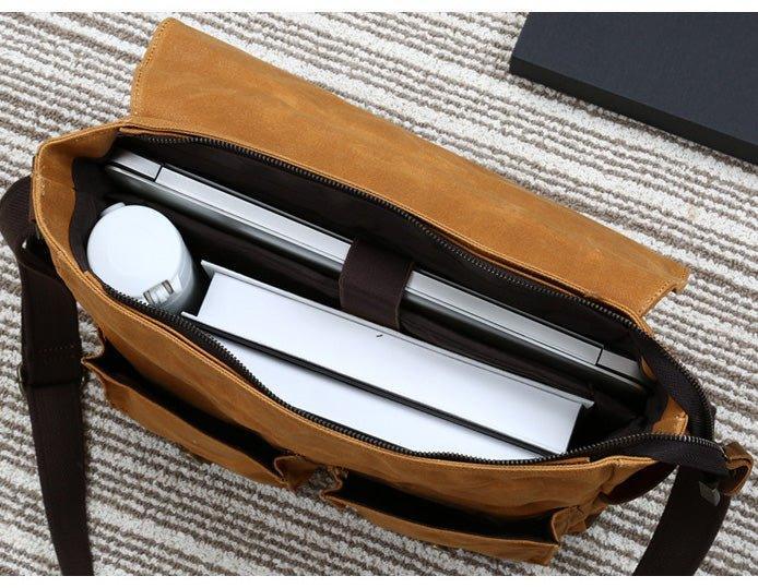 The Laptop Waxed Canvas Messenger Bag Mens is a stylish and functional bag that is perfect for everyday use. It is made from a waxed canvas material that is waterproof and durable. The bag features 2 side pockets for quick access items. The bag also comes with adjustable shoulder straps and a comfortable carrying handle. It is ideal for carrying laptops, books, documents, and other items.