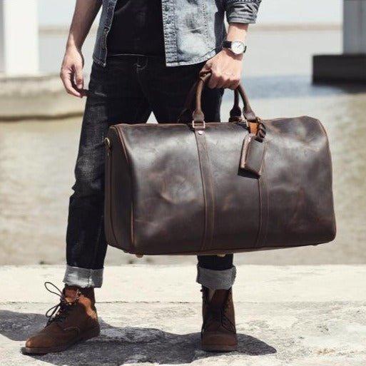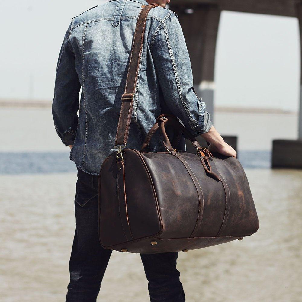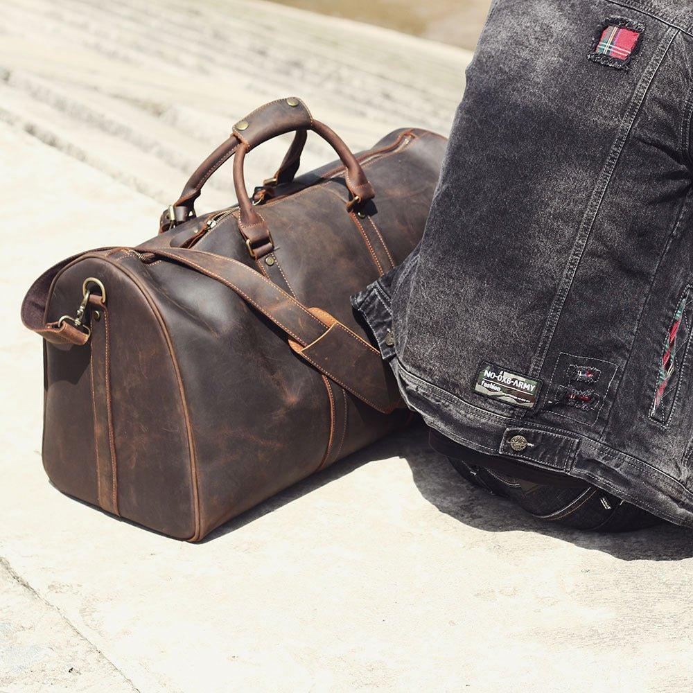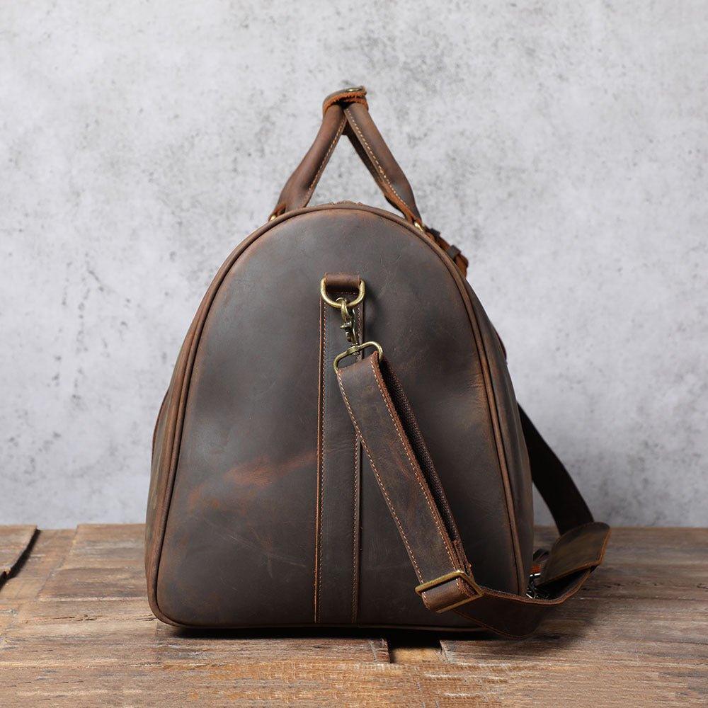 Leather weekender duffle luggage bag may have wrinkles,which makes the bag retro and unique.Rolled top handles with removable ID tag,adjustable and detachable shoulder strap with padded shoulder which release when carrying things heavy.