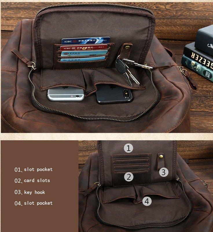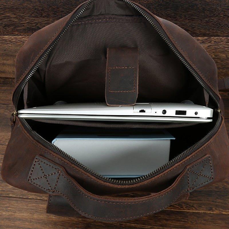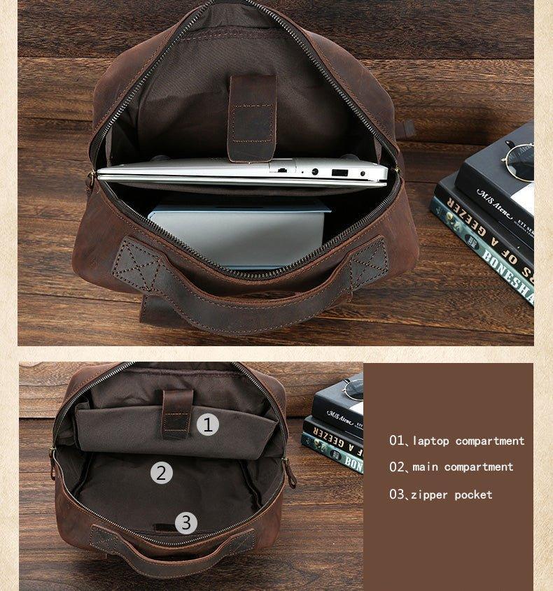 This backpack is made of top layer crazy horse genuine leather.This laptop backpack is perfect for office or daily use.Laptop pocket is padded to fit a 14 inch laptop,inner compartment for cell phone,front pocket with zipper for quick access.