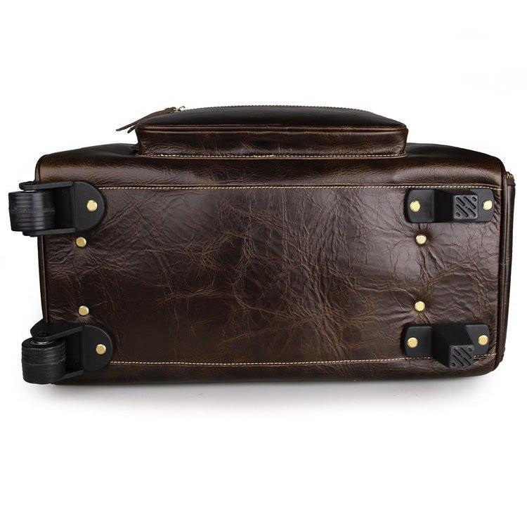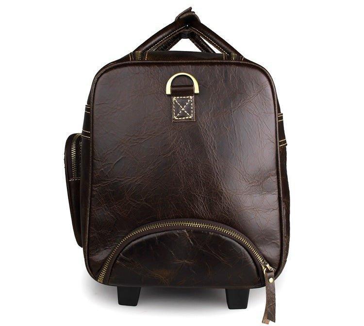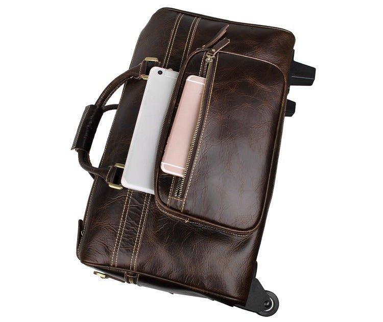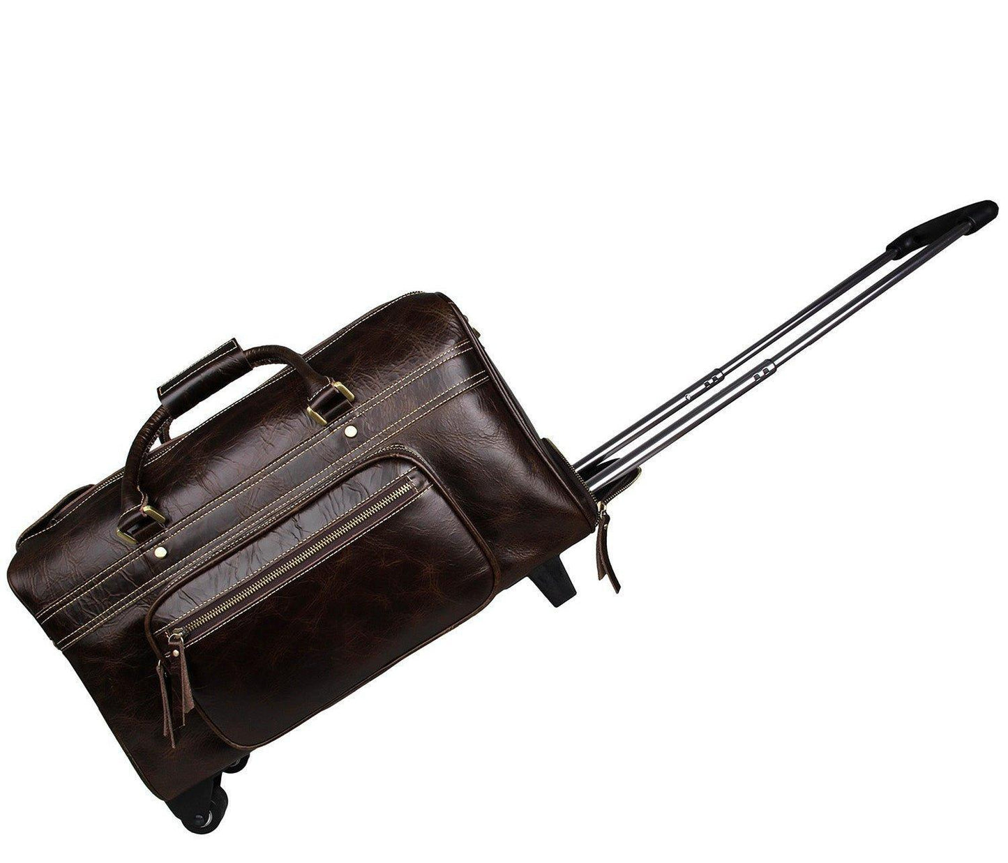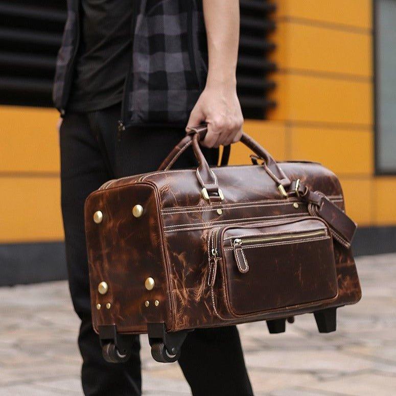 A practical versatile leather rolling duffle bag that can be used as a tote bag and travel trolley bag, carrying a telescopic handle and two roller skates for smooth glide; Made of luxurious cow leather, it looks better as you age, and the leather becomes soft and beautiful over time.