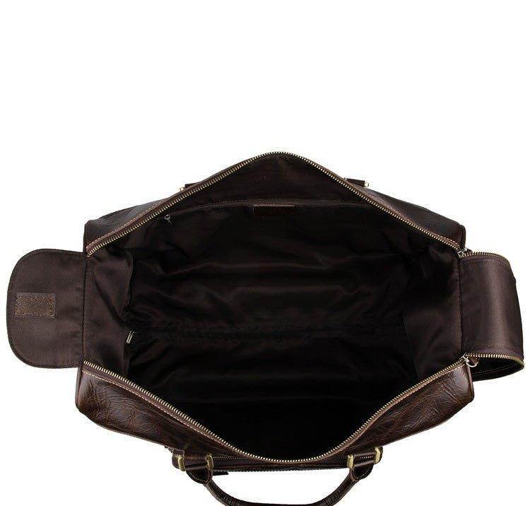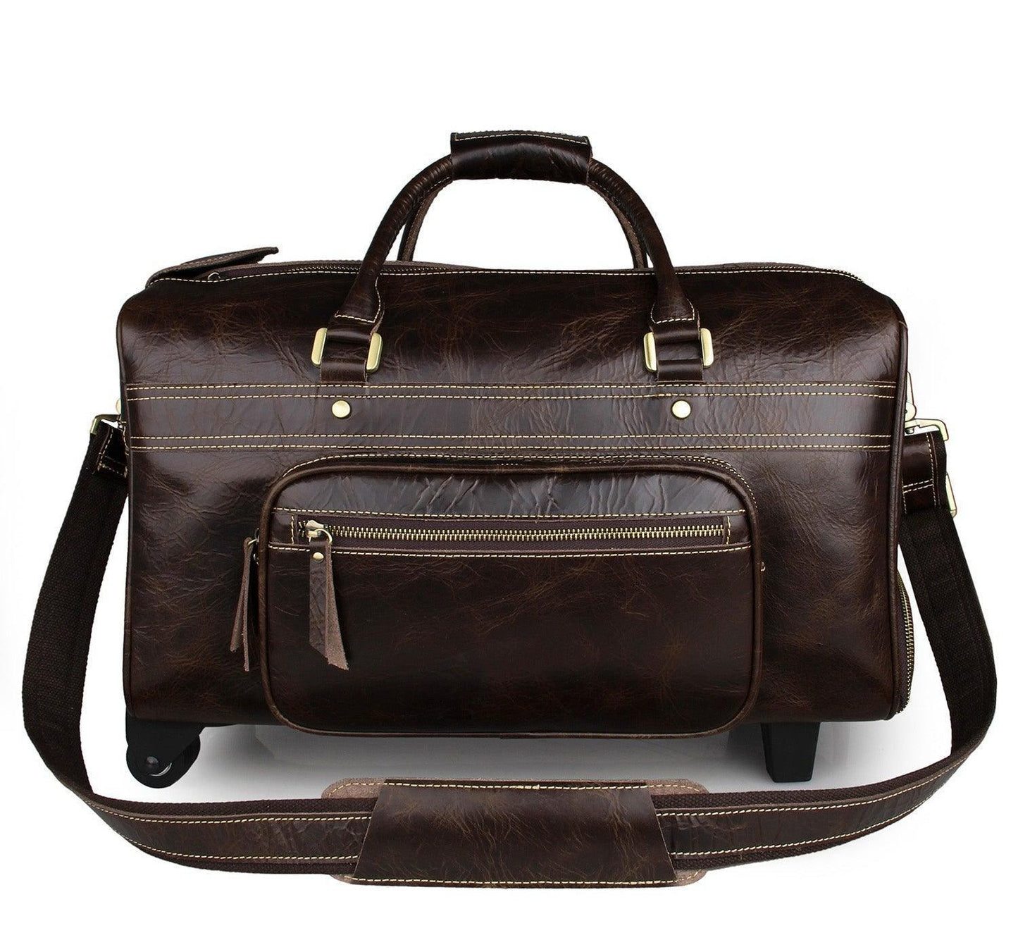 The leather duffle bag on wheels comes with a hand trolley to drag over,as carrying the luggage on the shoulder can be too stressful sometimes.The bag has a trolley with wheels for ease of access on that long trip of yours.