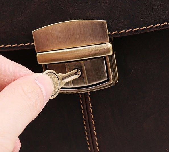 This briefcase with lock is made from full grain cowhide leather.The bag features multiple pockets inside,key lovk closure,padded shoulder strap,adjustable in length,can keep your belongings safe and secure.