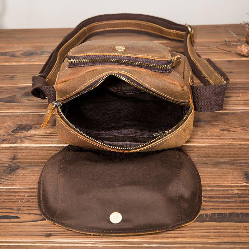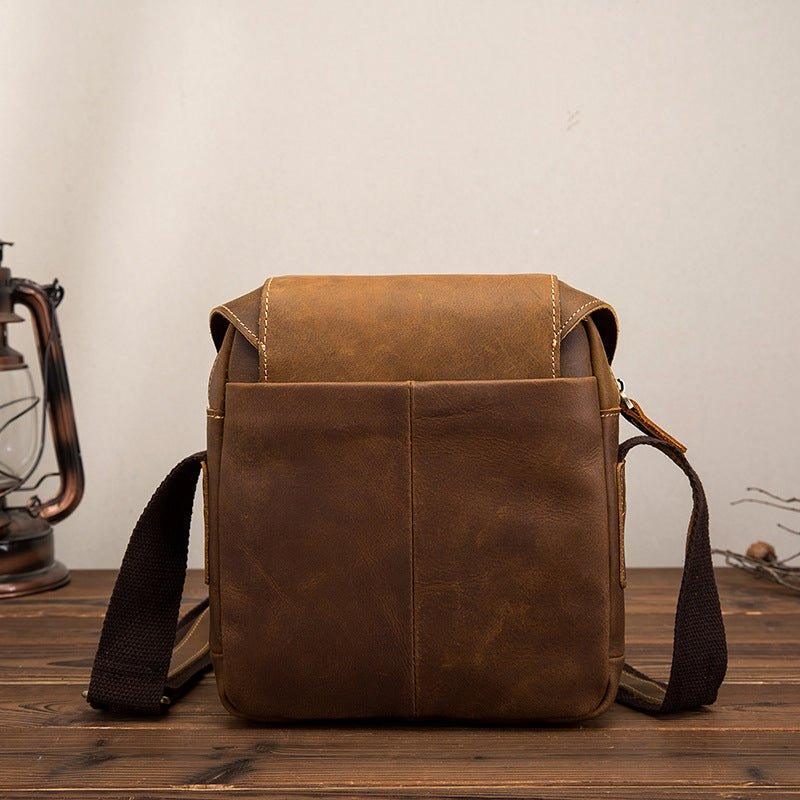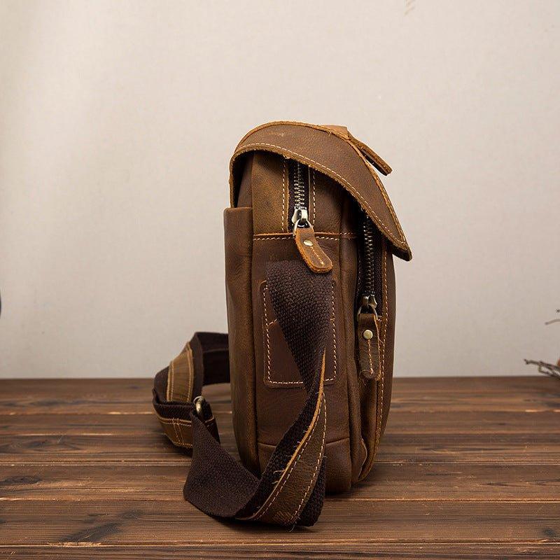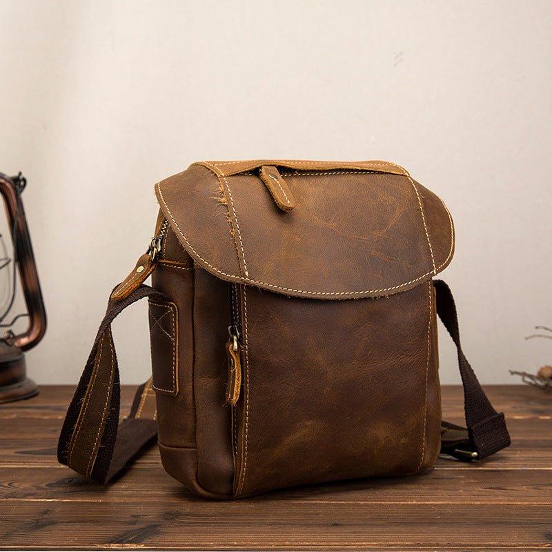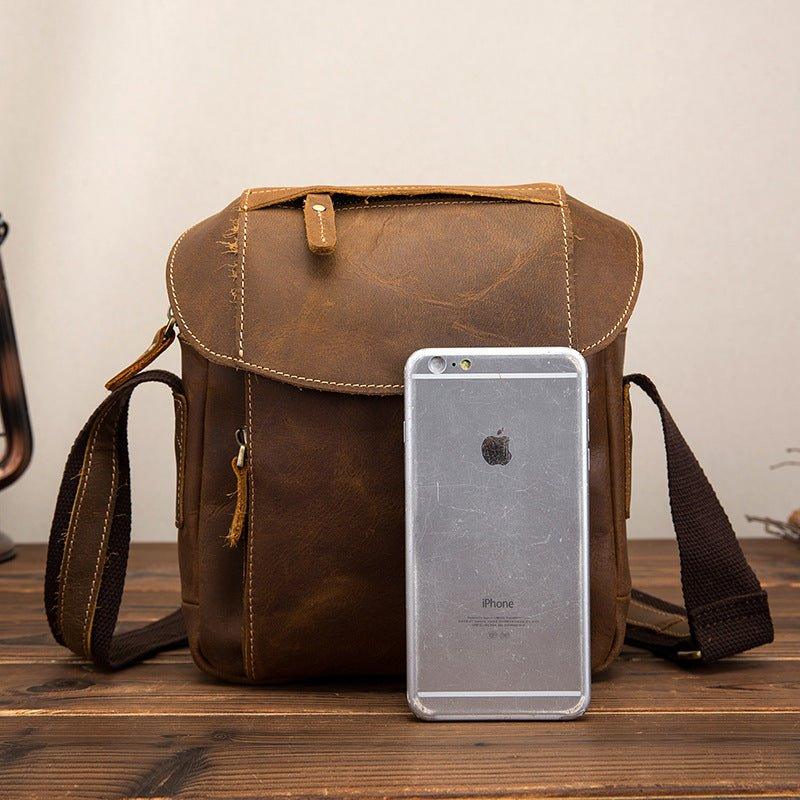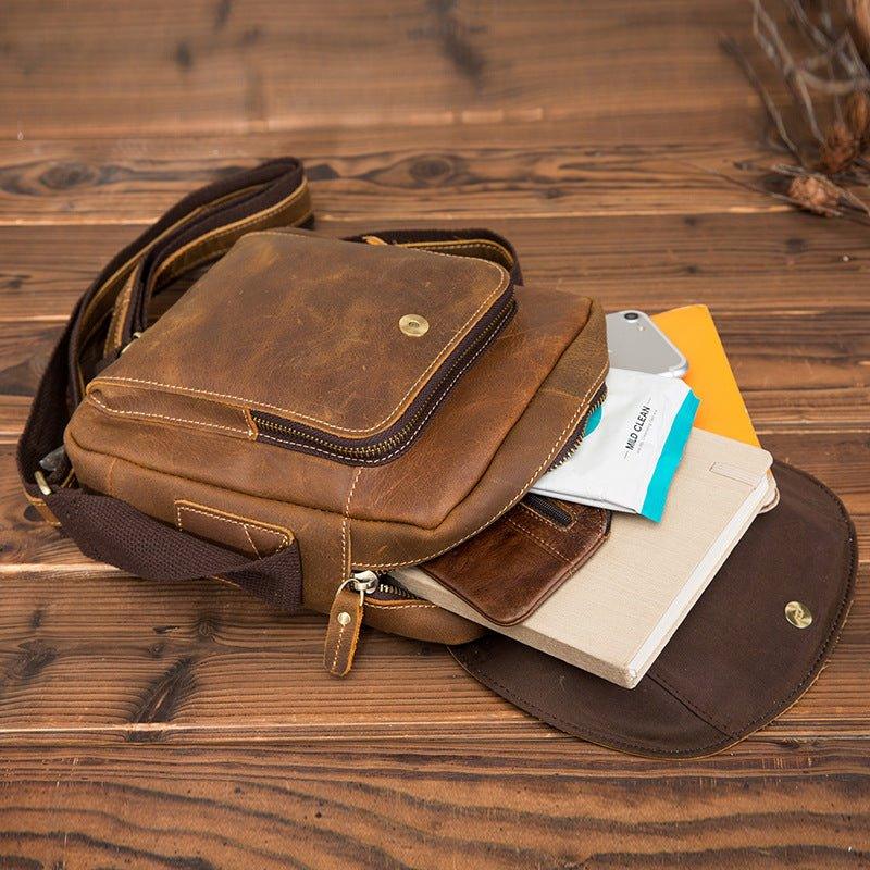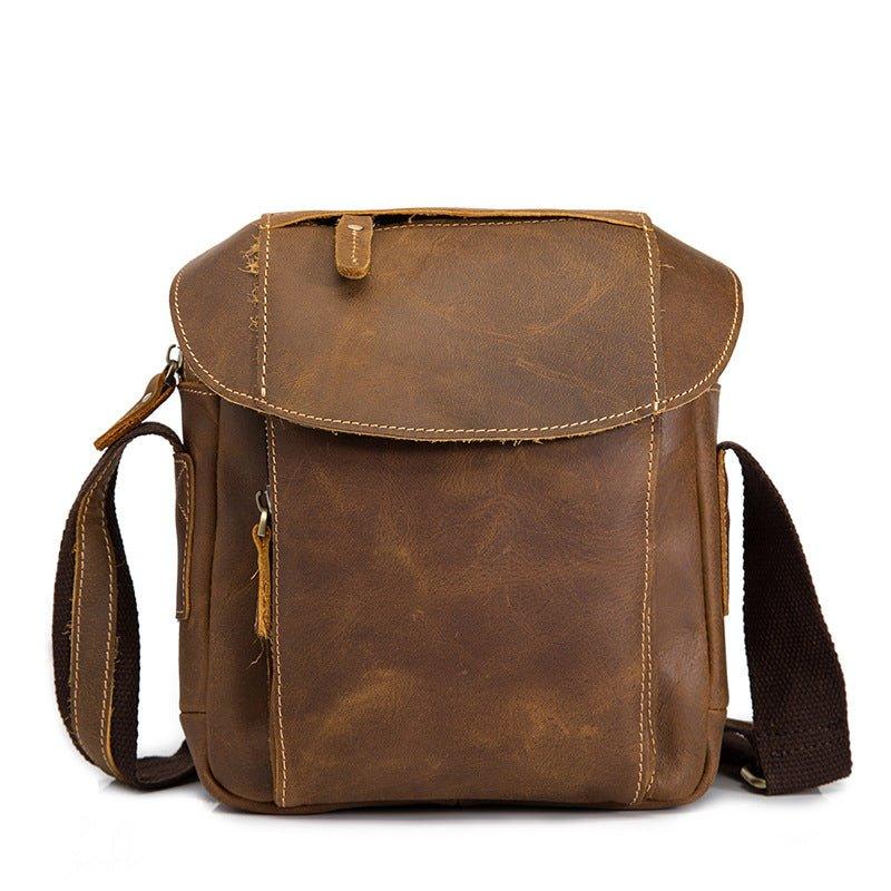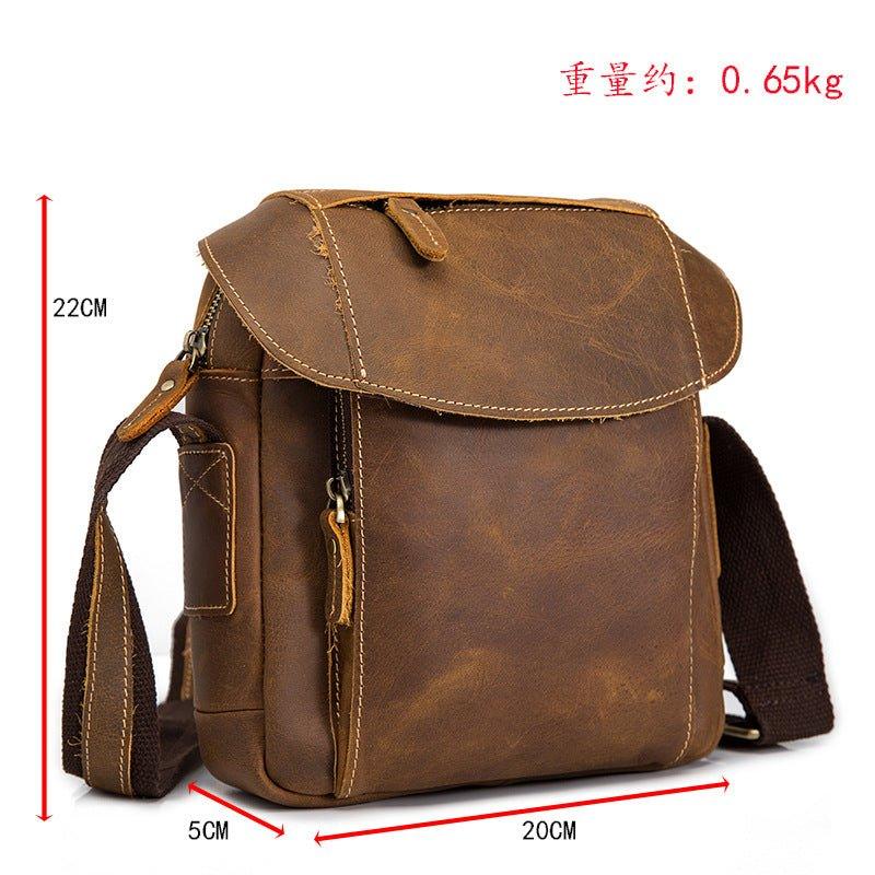 This small mens leather shouldder bag has multiple pockets for your daily things, and the main compartment is large enough for 9.7" iPad.