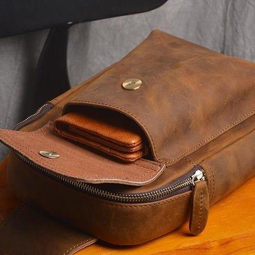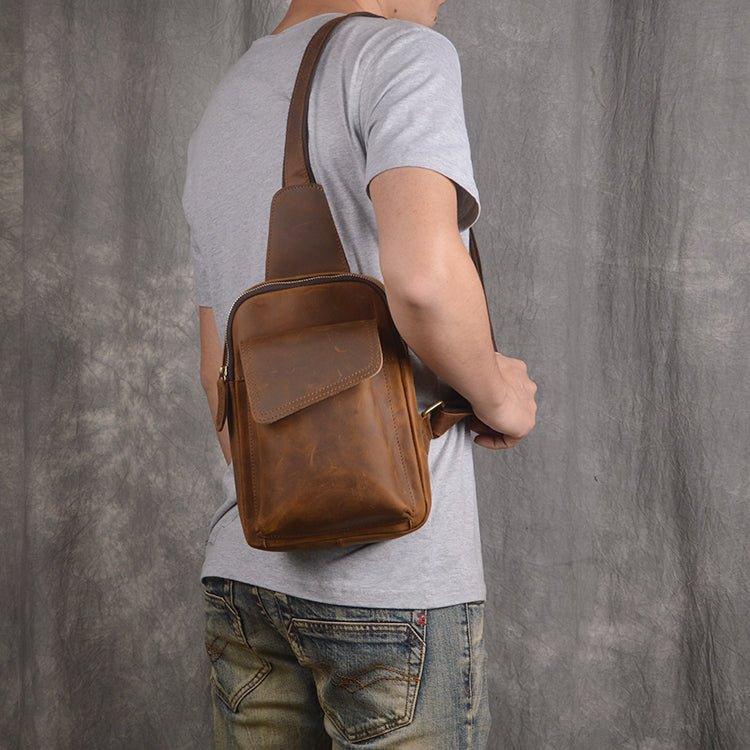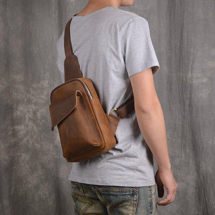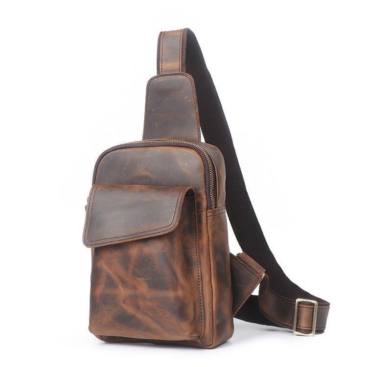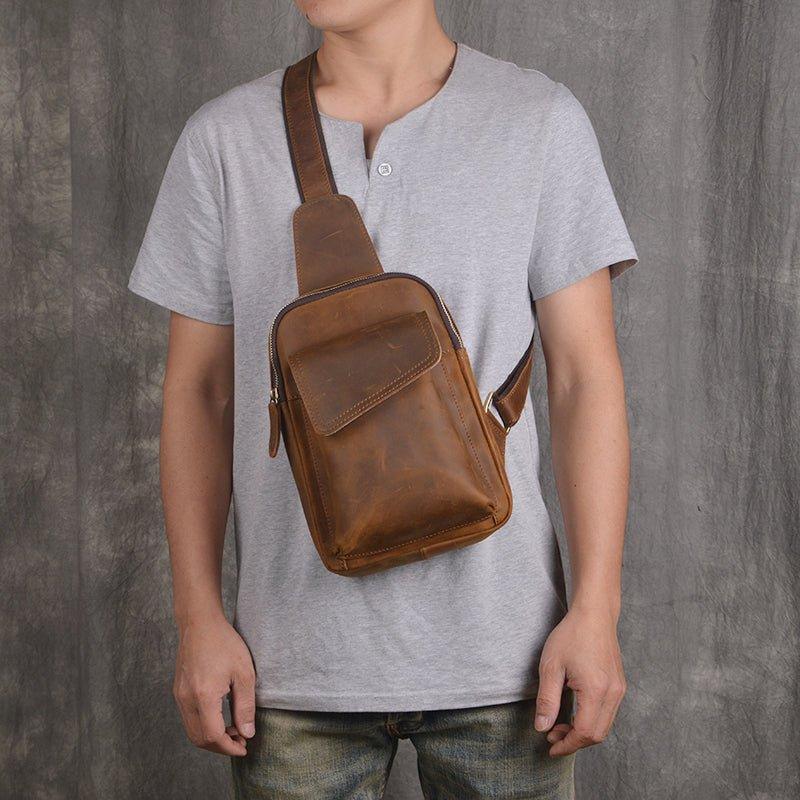 This mens sling bag is made of full grain cowhide crazy horse leather, messy wrinkles and scratches on the surface create a retro and wild looking.