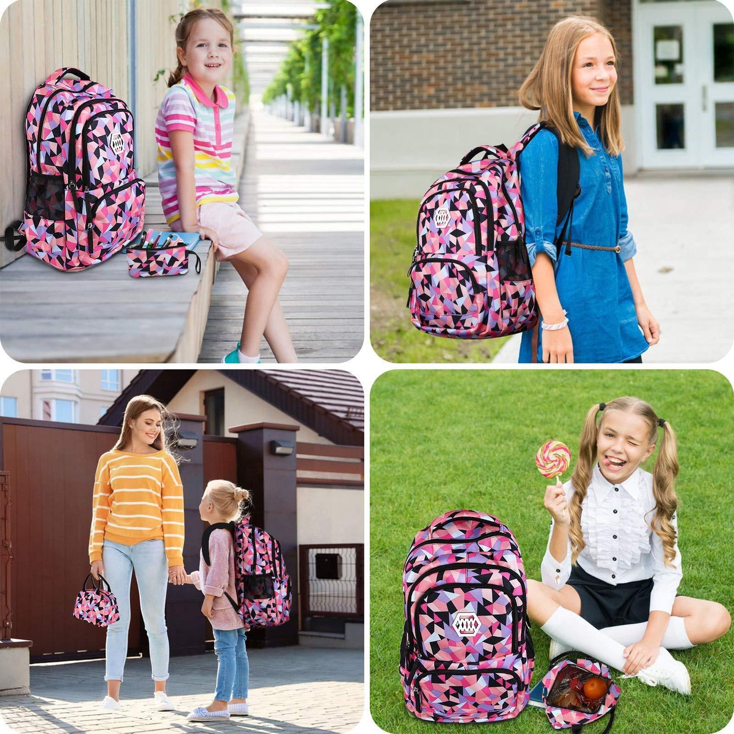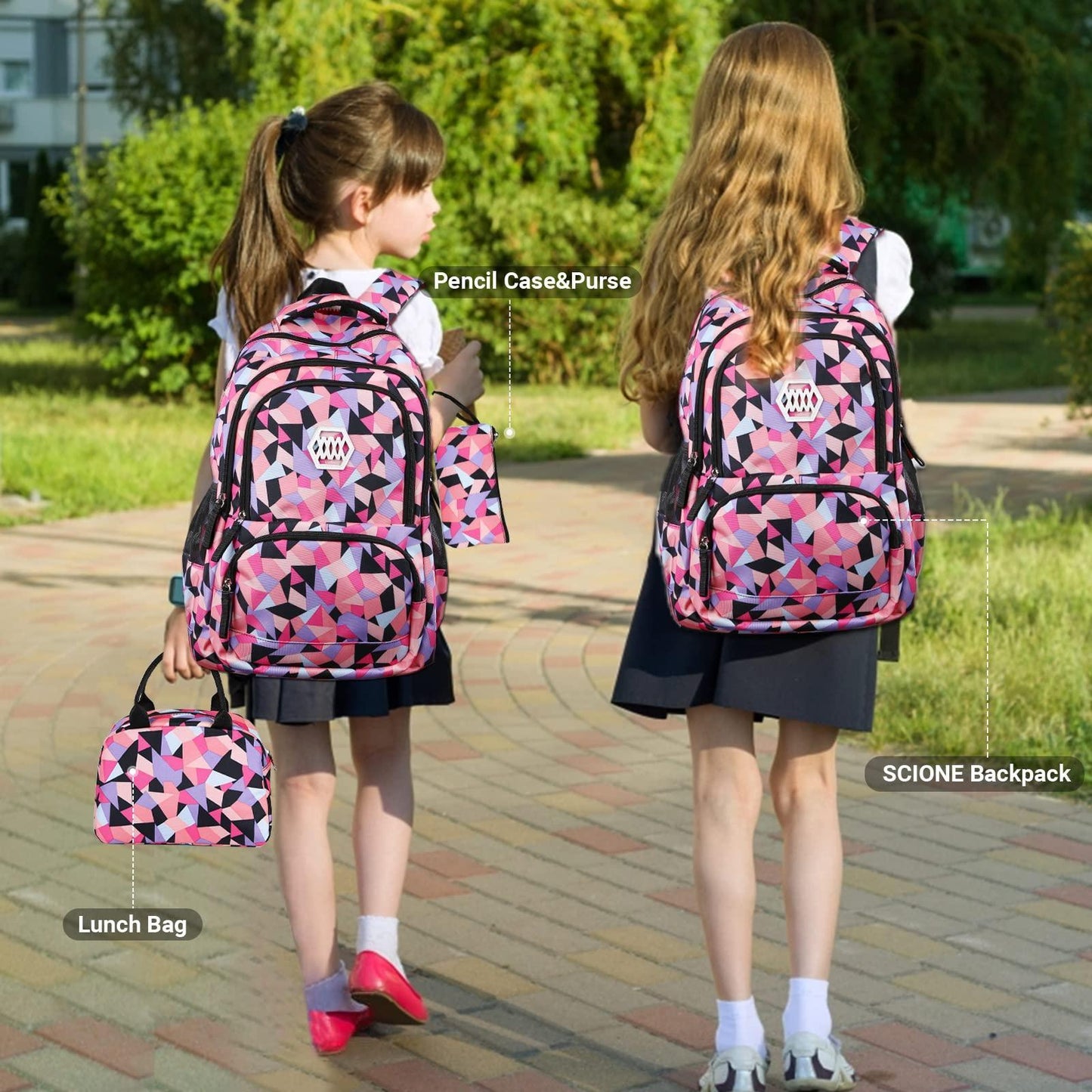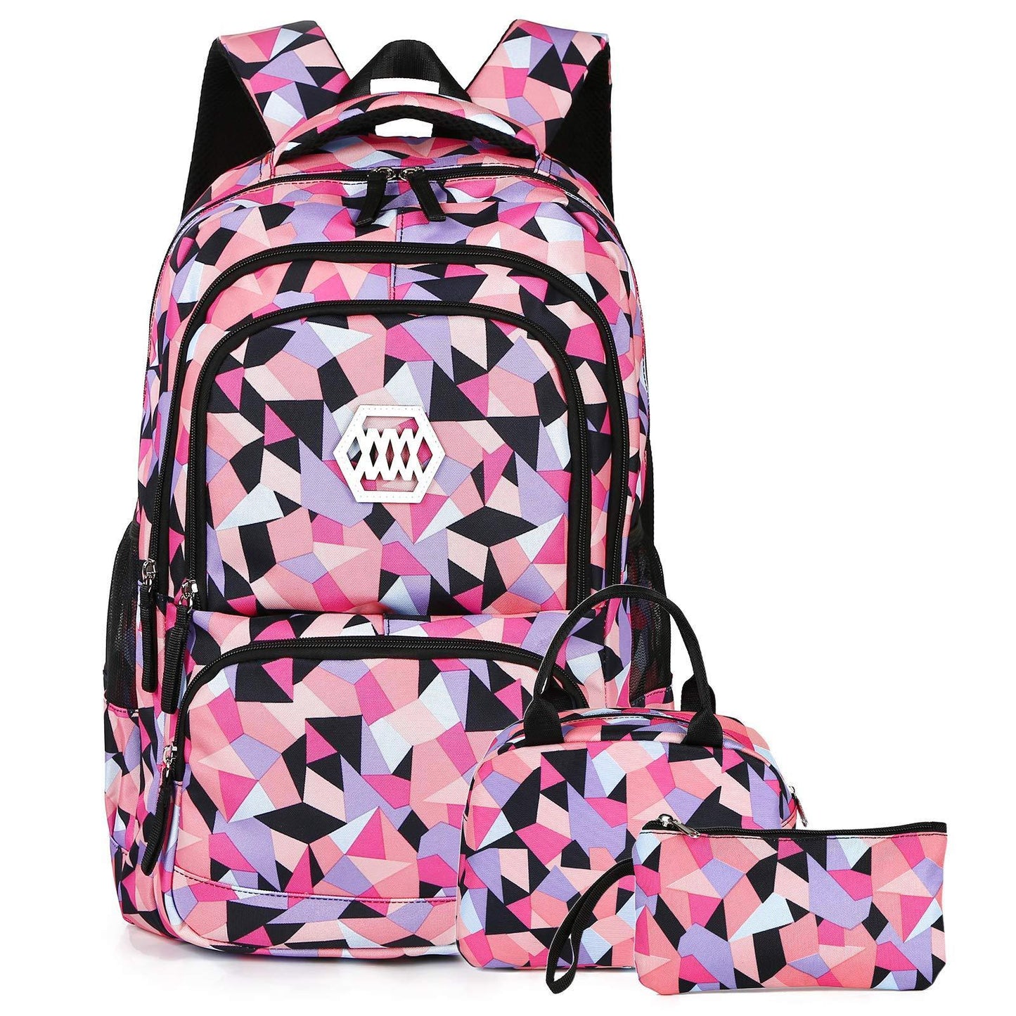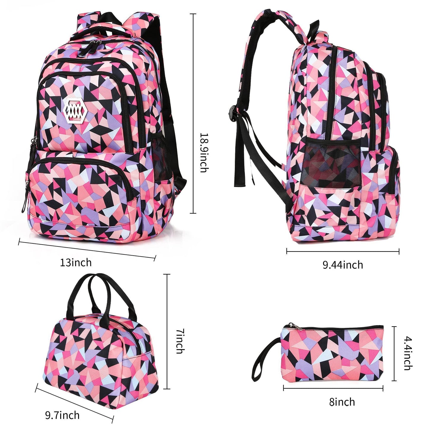 Four compartments for the school backpack ,one of maximal separate compartments with double-zipper closure holds 15.6 Inch Laptop as well as 15 Inch,14 Inch and 13 Inch MacBook/Laptop. 1big interior open pockets , Water-bottle and umbrella pockets on both sides .The pencil bag with special design and big enough. The lunch bag is big enough for your lunch food, fruit, a cup of yogurt, salad, a bottle of drink.