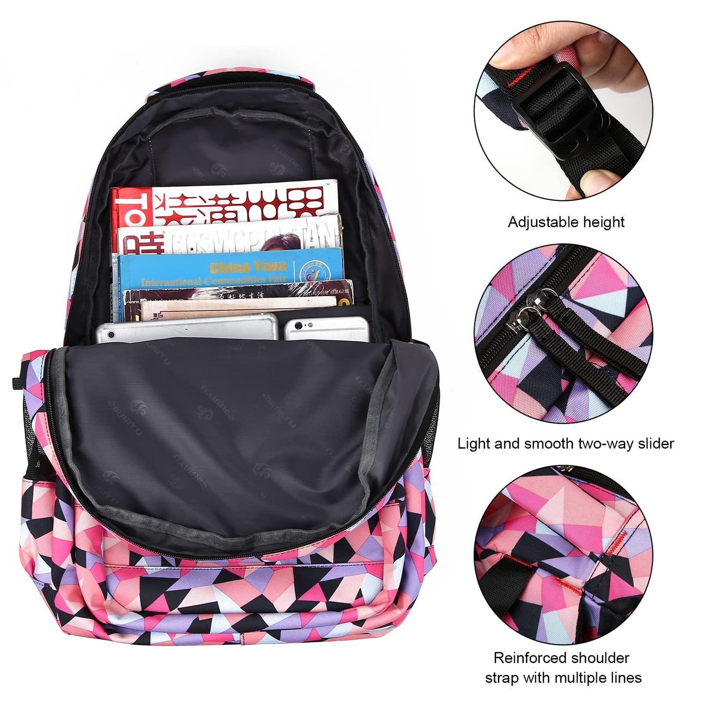 Comfortable airflow back design with soft and lightweight multi-panel ventilated padding on the women school backpacks with adjustable straps , Compressive strength of PVC handle gives you maximum back support. Breathable and adjustable shoulder straps relieve the stress of shoulder.